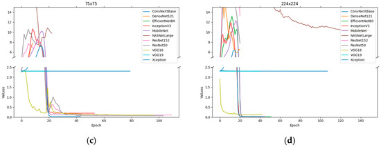 Validation loss for all the tested CNNs. When training some of the architectures, the early stopping condition was met. (a) The input image size is 75 × 75 with TL; (b) the input image size is 224 × 224 with TL; (c) the input image size is 75 × 75, no TL; and (d) the input image size is 224 × 224, no TL.