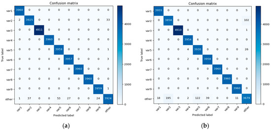 Confusion matrices of selected top-scoring models (a) InceptionV3, resolution of 224 × 224, no TL; (b) ResNet50, resolution of 75 × 75, no TL.