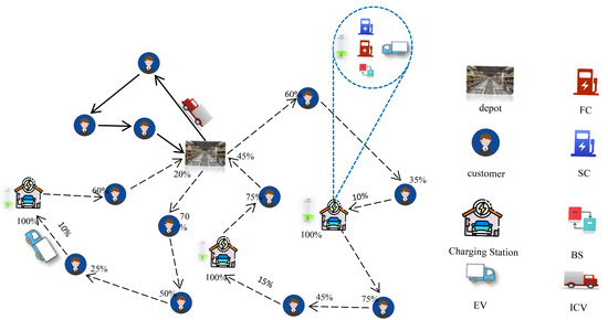 Electric vehicles start from the distribution center with a full battery. During delivery, if the battery level is insufficient to reach the next customer node, the vehicle selects a nearby charging station r for recharging. At each charging station, three charging methods are available: slow charging (SC), fast charging (FC), and battery swapping (BS). Each charging method has a distinct unit charging cost and charging power . Although fast charging requires less time, its unit charging cost is higher. Throughout the delivery process, electric vehicles must not violate the minimum battery level formula, and each electric vehicle is limited to a single charging event. This is illustrated in Figure 1.