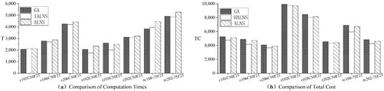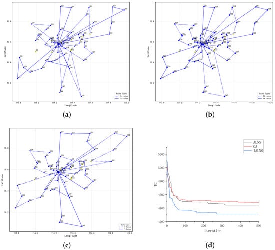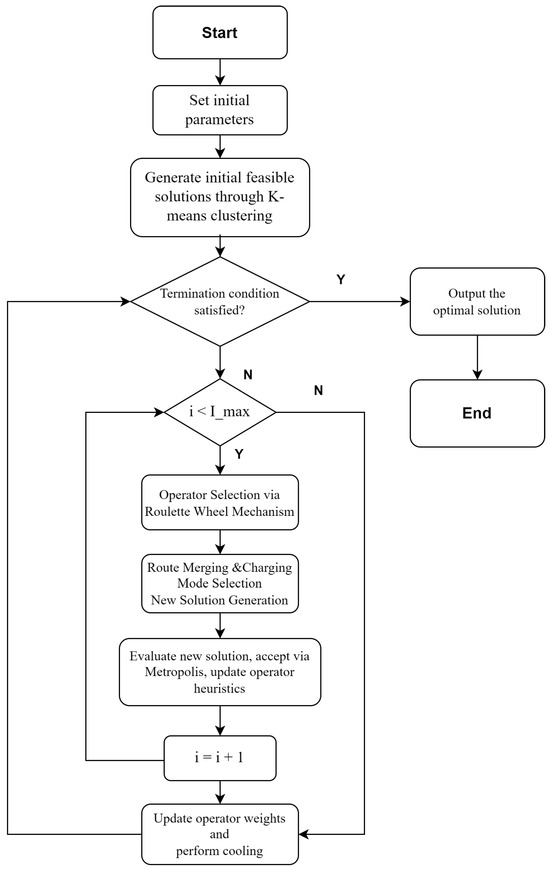 To address this, the paper adopts the Adaptive Large Neighborhood Search (ALNS) algorithm. Initially designed for the Vehicle Routing Problem with Backhauls (VRPB), ALNS includes multiple destruction and repair operators that are adaptively selected during iterations, making it an attractive choice for solving VRP and its variants [45]. In recent years, ALNS has been widely applied to solve distribution problems with mixed fleets [40] and green vehicle routing problems with time windows [46], achieving promising results.