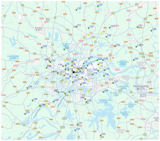 This study employs a K-means clustering method to generate an initial feasible solution for the vehicle routing problem. The customer nodes are first clustered using the following approach: the number of clusters K is determined by the formula , where represents the demand of customer i, C is the set of customers, and and denote the load capacities of electric and fuel vehicles, respectively. K initial centroids are randomly sampled from the customer node set, and each customer node is allocated to the closest cluster by computing the Euclidean distance between the node and each centroid, in line with the nearest-neighbor principle. After cluster formation, customer nodes within each cluster are sorted according to the average value of their individual time windows. Once the clustering process is finalized, the initial feasible solution for the distribution routing problem is constructed following the steps detailed below: