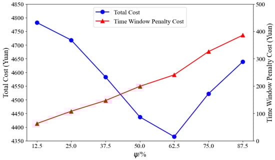 Time Window Penalty Cost (): Each customer node has a specific time window for receiving service. If a vehicle arrives outside this time window, a time window penalty cost is incurred. The time window penalty cost is calculated as follows: