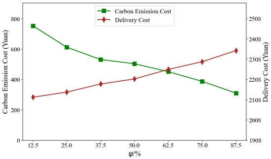 Carbon Emission Cost (): Carbon emissions for fuel vehicles (FV) are measured using the Fuel Consumption Rate (FCR) model; i.e., the total vehicle weight is inversely proportional to the mileage per unit fuel, and this relationship is further translated into a positive correlation between the FCR and total vehicle weight [44], while carbon emissions for electric vehicles during operation are evaluated using a Life Cycle Assessment (LCA) approach. The FCR for FV with load is given by the following: