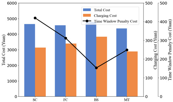 Based on figures issued by the International Energy Agency, 2023 witnessed a 1.1% growth in global energy-associated CO2 emissions. The emissions rose by 410 million tonnes compared to prior levels, ultimately hitting a record-breaking 37.4 billion tonnes. The transportation sector exhibited the most significant growth, contributing nearly 240 million tonnes to this increase [1]. To achieve the ambitious goal of the Paris Agreement to limit global warming to 1.5 °C to 2 °C by the end of the century, and in response to the pronounced rise in transportation-related carbon emissions, many automakers, supported by government policies, have begun transitioning to greener vehicles by replacing traditional fuel vehicles (FVs) with new energy vehicles. These include fuel cell vehicles powered by hydrogen, methanol, or ethanol, as well as plug-in hybrid vehicles, with battery electric vehicles (EVs) being the most widely adopted. EVs offer advantages such as zero emissions [2], high efficiency, and low noise [3,4,5], promoting environmental sustainability [6,7,8]. However, EVs face challenges in practical transportation applications. The uneven distribution of charging infrastructure across cities impacts route planning [9,10], and the relatively long charging times, compared to the refueling times of traditional FV, can lead to delays in meeting specific service time windows for customers [11,12]. To address these challenges, various charging strategies have been proposed. Partial charging involves charging the battery to the required level at charging stations based on the assigned route, thereby reducing charging time. However, frequent partial charging in long-distance, multi-customer deliveries may adversely affect battery lifespan [13,14,15]. Battery swapping significantly reduces recharging time and can extend vehicle lifespan, but its adoption is limited by challenges in battery standardization, as different vehicle models and manufacturers use non-uniform battery specifications. Additionally, the construction of battery-swapping stations, battery standardization, and the establishment of supporting logistics systems require substantial upfront investment, making the approach less economically viable for small-scale fleets [16,17,18]. Another approach incorporates multiple charging modes into the Electric Vehicle Routing Problem (EVRP) model, allowing vehicles to select different charging methods and amounts at various station types to optimize overall travel time and costs [19,20,21]. Furthermore, some studies suggest using a mixed fleet of FVs and EVs, where FVs handle time-sensitive, long-distance, or infrastructure-scarce orders, while EVs are prioritized for short-distance, charging-accessible delivery tasks, thereby reducing time window penalties and operational costs [22,23].