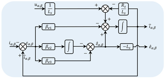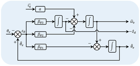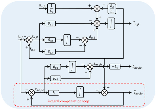 In order to suppress the DC bias during back electromotive force observation, the observer is combined with integral compensation. The structural block diagram is shown in Figure 4. The IC-ELESO scheme is designed as