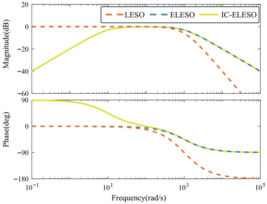 We then analyzed its amplitude-phase characteristics and constructed the Bode diagram, as shown in Figure 5. In the figure, of LESO and ELESO is set to 1000 rad/s, of IC-ELESO is set to 1000 rad/s, and k is set to 10. It can be seen that compared with LESO and ELESO, IC-ELESO can eliminate DC error and improve position estimation accuracy. In addition, IC-ELESO has a simple structure and easy parameter tuning.