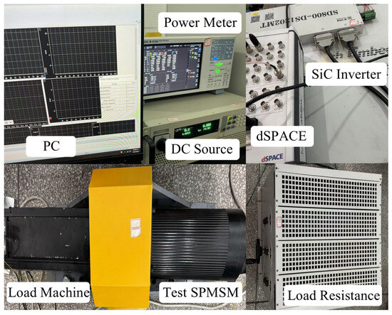 In order to further verify the feasibility and effectiveness of the control method proposed in this paper, an SPMSM experimental platform was built, as shown in Figure 7. The specific parameters of the SPMSM used are shown in Table 1. A dSPACE DS1202 real-time control system with a sampling frequency of 20 kHz is utilized as a controller. An SiC MOSFET-based inverter is utilized as a driver. The dead-time of the inverter is set to 3.12 μs. The speed-loop sampling frequency is 2 kHz.