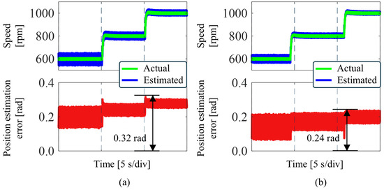 Figure 9 shows the experimental waveform of the motor under a load of 0.5 N·m, with the speed ranging from 600 to 800 to 1000 rpm. Figure 9a shows the experimental waveform of QPLL, and Figure 9b shows the experimental waveform of IQPLL. In both QPLL and IQPLL, BEMF is obtained using the LESO approach. In Figure 9, as the motor speed increases, the position estimation accuracy decreases, which verifies the low-pass filtering characteristics of LESO. The higher the motor speed, the more obvious the phase delay, and the position estimation accuracy is reduced. It can be seen that during the motor acceleration process, the maximum position estimation error obtained by QPLL is 0.32 rad, and the maximum position estimation error obtained by IQPLL is 0.24 rad. Under rapid changes in motor speed, the position estimation error of IQPLL is reduced by 25% compared with QPLL. Therefore, under both steady-state operation and speed acceleration, the IQPLL position estimation method proposed in this article demonstrates superior performance and provides higher estimation accuracy.