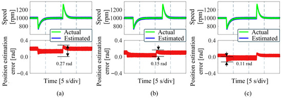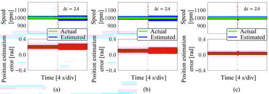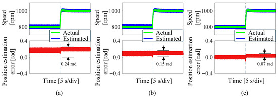 Figure 10 shows the experimental waveform of three schemes under the motor speed changing from 800 to 1000 rpm, and the load is 0.5 N·m. The position estimation method used by the three BEMF observation schemes is IQPLL. Figure 10a shows the experimental waveforms of the LESO. It shows that the LESO position estimation error is 0.24 rad at a motor speed of 1000 rpm. Figure 10b shows the experimental waveforms of the ELESO. It shows that the ELESO position estimation error is 0.15 rad at a motor speed of 1000 rpm. Figure 10c shows the experimental waveforms of the proposed IC-ELESO. It shows that the position estimation error is 0.07 rad at a motor speed of 1000 rpm. The proposed IC-ELESO reduces position estimation error by 70.8% compared to the traditional LESO under conditions of varying motor speed and by 53.3% compared to the ELESO under conditions of varying motor speed. Compared with LESO and ELESO, the IC-ELESO position estimation error proposed is relatively small. The high position accuracy of IC-ELESO has been verified.