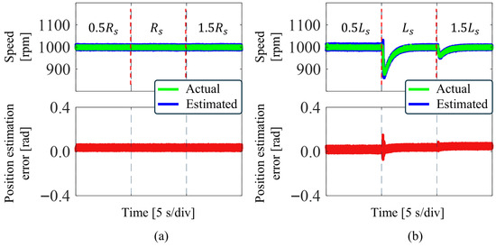 Figure 13 shows the experimental waveforms of the proposed method under varying motor parameters, with the motor speed set at 1000 rpm. Figure 13a indicates that under resistance variations, the motor speed remains essentially unchanged, and the position estimation error stays constant. Figure 13b demonstrates that under inductance variations, the motor speed fluctuates briefly before stabilizing, while the position estimation error remains largely unchanged. It can be concluded that the proposed method exhibits robustness under varying motor parameters.