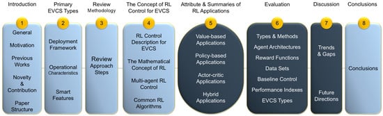 - Section 1 introduces the general status of RL for EVCSs, the motivation for this review, previous contributions, and the paper structure.
