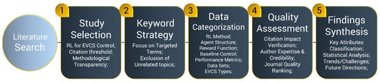 - Quality Assessment: To maintain analytical rigor, a quality-assessment framework was applied. Citation counts from Scopus served as a primary filter, based on the thresholds noted earlier. Beyond citation metrics, the academic standing of the authors and their institutional affiliations were also considered, particularly their contributions to RL, energy systems, or EV-infrastructure research. Studies with well-defined experimental setups, clearly justified reward structures, and comprehensive comparisons with baselines were prioritized. Emphasis was placed on works that introduced methodological or architectural innovations and reported extensive evaluations using recognized performance indicators.