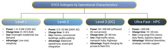 Another important classification of EVCSs relates to their operational characteristics, specifically the power output and corresponding charging speed (see Figure 5). Such factors not only influence the charger’s suitability for different contexts—residential vs. highway—but also affect energy management, grid load, and user convenience. The four primary EVCS types (See also Figure 5) vary significantly in terms of power capacity, infrastructure cost, and deployment use cases [78,79]: