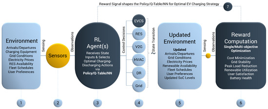 A step-by-step description of the RL control optimization procedure for EVCSs—along with interactions with other energy system components—is illustrated in Figure 6 and outlined as follows: