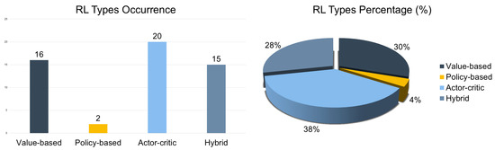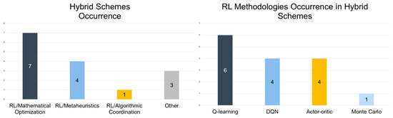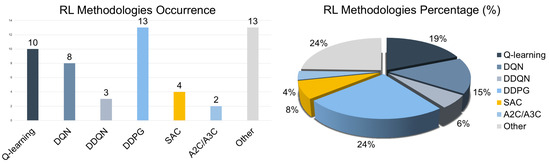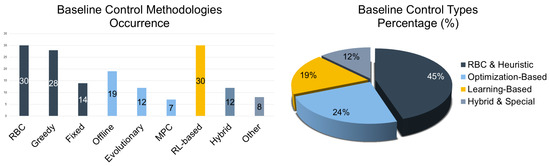 When compared to conventional methods like rule-based control (RBC) or MPC, RL offers considerable advantages in adaptability, scalability, and handling system nonlinearity and stochasticity [49,50]. It is particularly well-suited to managing large-scale, heterogeneous EVCS networks with minimal reliance on precise modeling. Moreover, RL agents may be tailored to optimize multiple, often competing objectives—such as user satisfaction, grid stability, and energy cost—by continuously adjusting charging strategies in response to real-time operational data [51,52,53]. RL-based control also supports integration with vehicle-to-grid (V2G) technologies [54,55,56], renewable energy sources (RESs) [57,58], and shared infrastructure scenarios [59]. Such features position RL as a powerful tool for next-generation EVCS management, especially in contexts where traditional optimization methods struggle to scale or adapt effectively [11]. In particular, in cases where adaptive control, such as RL, is integrated as a hybrid control scheme, methodological advances further demonstrate the potential of optimization and decision-making as concerns complex, non-linear domains [60,61].