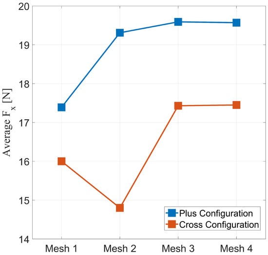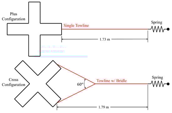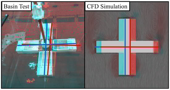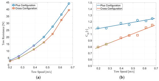 The tow resistance tests revealed that the plus configuration exhibited an average of 20% greater tow resistance than the plus configuration across the tow speeds. Consequently, the calculated drag coefficients were greater for the plus configuration. The cross configuration exhibited smaller tow resistances and drag coefficients for all tow speeds. These differences indicate that the orientation of the cruciform shape played a significant role in the drag behavior of the two configurations.