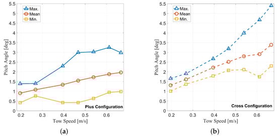 Figure 11a,b, respectively. The maximum, mean, and minimum pitch angles are exhibited for each tow speed. The maximum, mean, and minimum values represent the average of the parameters across all the trials at each tow speed. A positive pitch angle represents an angle towards the front of the structure where the towline is connected.
