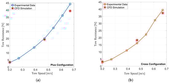 Figure 13a,b, respectively, with three points representing tow speeds at which CFD simulations were conducted. The tow resistance value from the CFD tests is determined by the calculated force on the CFD body in the flow direction (x-direction).
