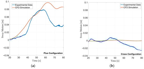 cross configuration sway motions in CFD were low-magnitude offsets and oscillatory about zero, matching the behavior seen in experimental testing. The similarities observed indicate that the drifting sway motion may be due to flow effects captured by the CFD model.