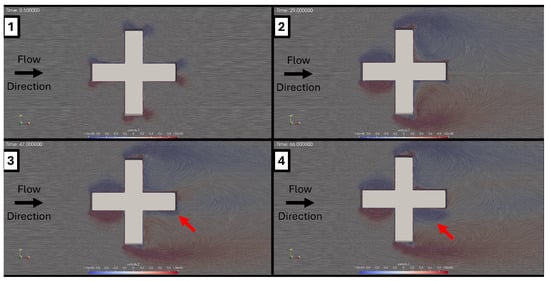plus configuration simulations, an asymmetric vorticity formation appears in frames 3 and 4, which are related to the drifting sway behavior of the model. These asymmetric vorticity features were not present in the simulations in the