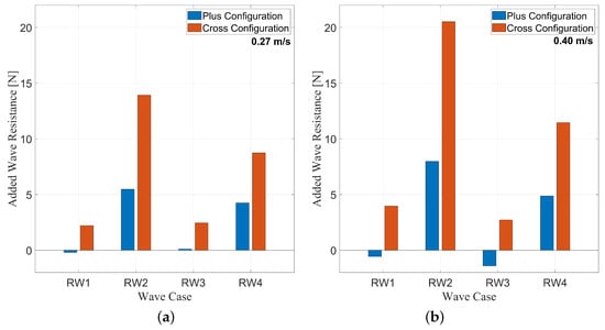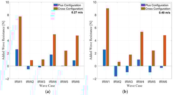 Figure 17a,b provide the added resistance in regular wave cases at tow speeds of 0.27 m/s and 0.40 m/s, respectively.