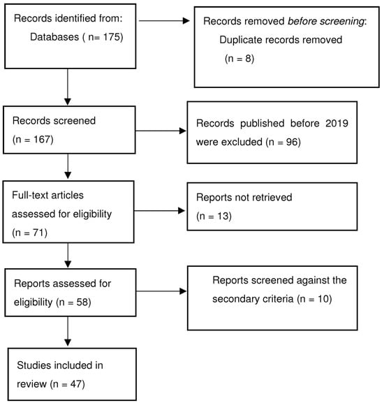 The initial literature search yielded 167 articles. These records were collected using targeted keyword combinations and limited to publications not older than 2019. After removing 96 articles based on publication date and language criteria, 71 records remained for further screening. These were assessed against the primary inclusion and exclusion criteria, which reduced the number of articles to 58. After applying secondary filters including detailed evaluation of titles, abstracts, and keywords an additional 10 studies were excluded. The exclusion criteria encompassed articles that were not peer-reviewed, lacked direct relevance to the built environment, or fell outside the defined temporal or linguistic parameters. The final number of articles included for full review and analysis was 47.