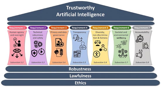 In parallel with technological progress, ethical considerations and governance frameworks are becoming central to AI deployment. The EU has taken a leading role by introducing regulations for “trustworthy AI” combining legal, ethical, and technical standards [23,24]. These guidelines define seven key requirements: human oversight, safety, privacy, transparency, fairness, societal well-being, and accountability (Figure 4) [23]. This risk-based regulatory model is central to the EU AI Act, ensuring responsible AI development and use [25].