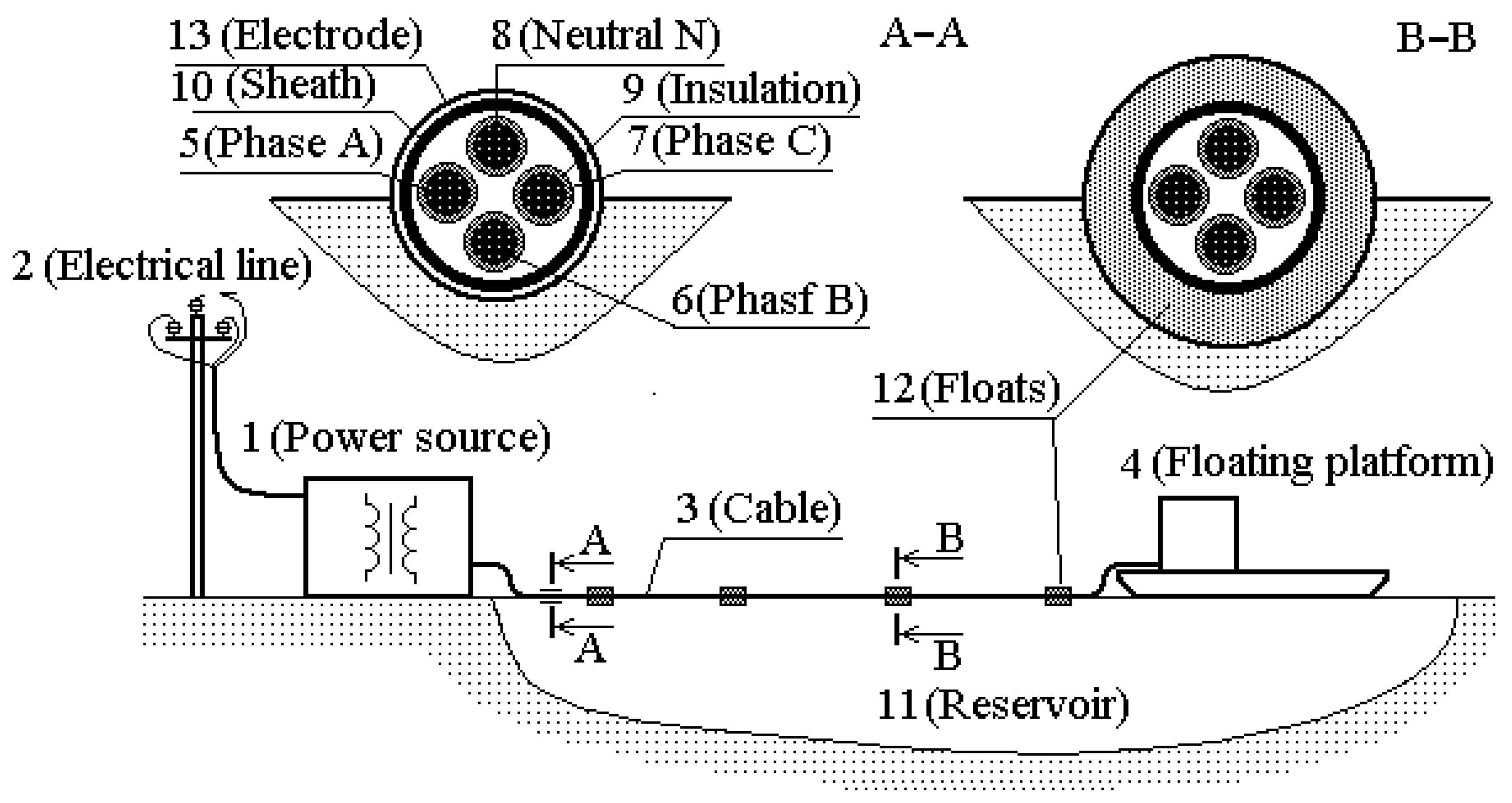 6]. The high-voltage winding of its transformer is connected to overhead electrical line 2. On the low-voltage side, the transformer is connected to the internal network of salt-producing floating platform 4 with four-core power cable 3. Cores 5–7 of this cable are connected to phases A, B, and C of power source 1; core 8 is connected to neutral N of power source 1 in the low-voltage side of the transformer. These cores have insulation 9, and cable 3 has sheath 10. To ensure the buoyancy of four-core power cable 3 during the motion of salt-producing floating platform 4 along the surface of reservoir 11, floats 12 are put on the cable. Since the salt-producing platform should move along the water surface, and to simplify the protection design, electrode 13 of the protection is recommended to be made in the form of a metal ring fixed on the power cable. In the future, this electrode will be called a voltage sensor.
