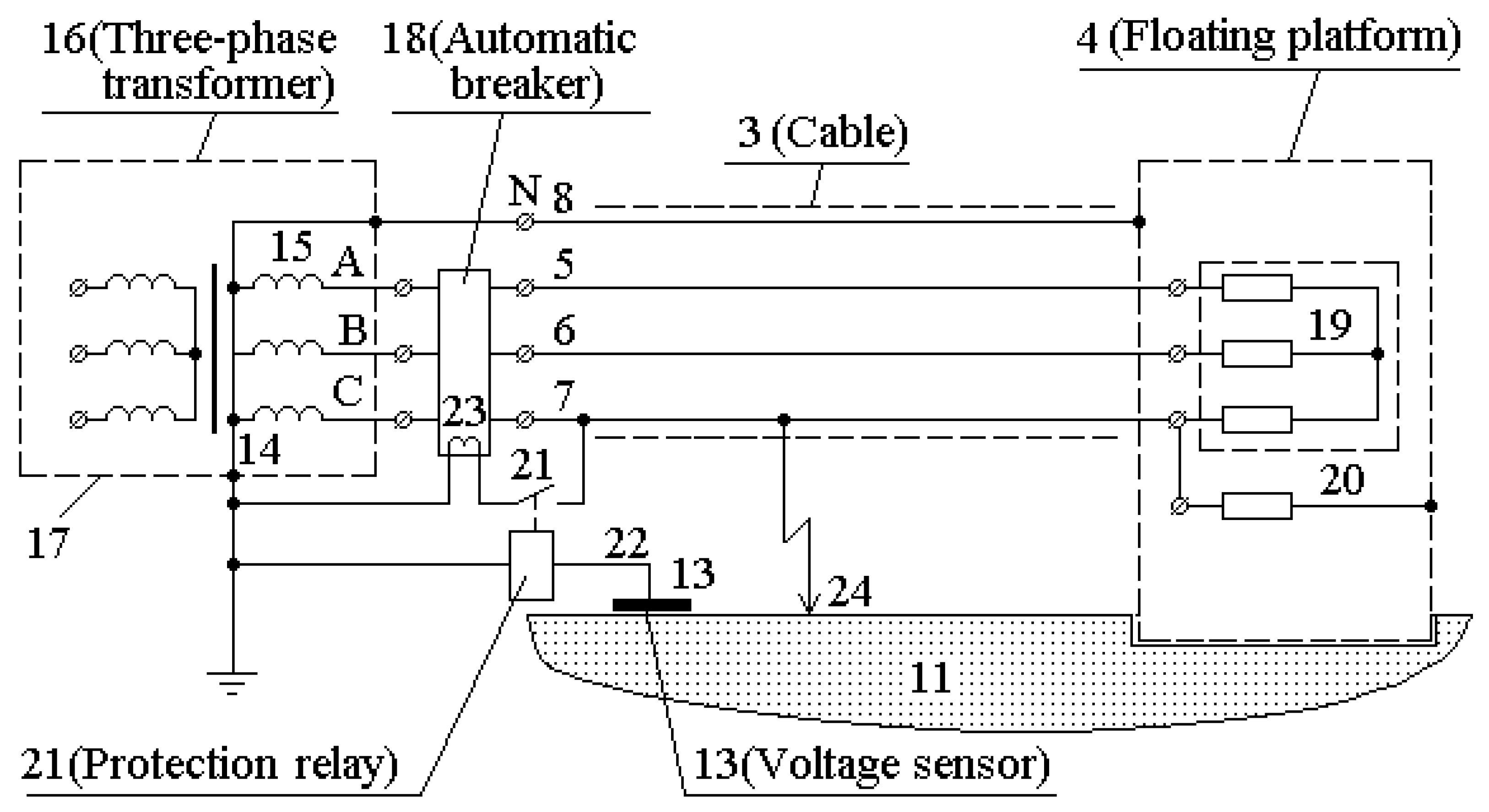 Figure 2 shows the electrical circuit of the power supply system of salt-producing floating platform and four-core cable 3 protection. It shows that neutral 14 of secondary winding 15 of three-phase transformer 16 is connected to grounding contour 17 of the transformer substation and is grounded. Neutral core 8 is bolted to grounding contour 17 and the metal casing of floating platform 4.