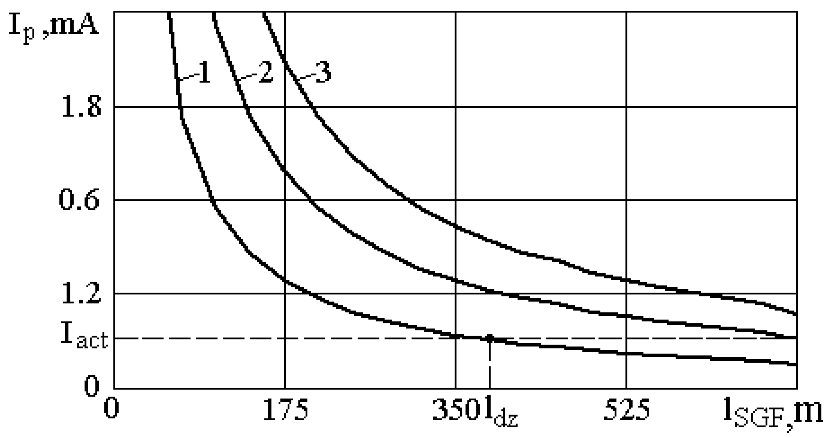 SGF) curves with the relay actuation current (dashed line). One can see that if the voltage sensor is spaced 3.5 m apart from the shore, then the protection dead zone is approximately 370 m long. If the voltage sensor is spaced 7.0 m apart from the coast, this zone is absent. Hence, the SGF protection voltage sensor should be fixed just at this latter distance. This distance can be reduced by using a protection relay with lower actuation current.