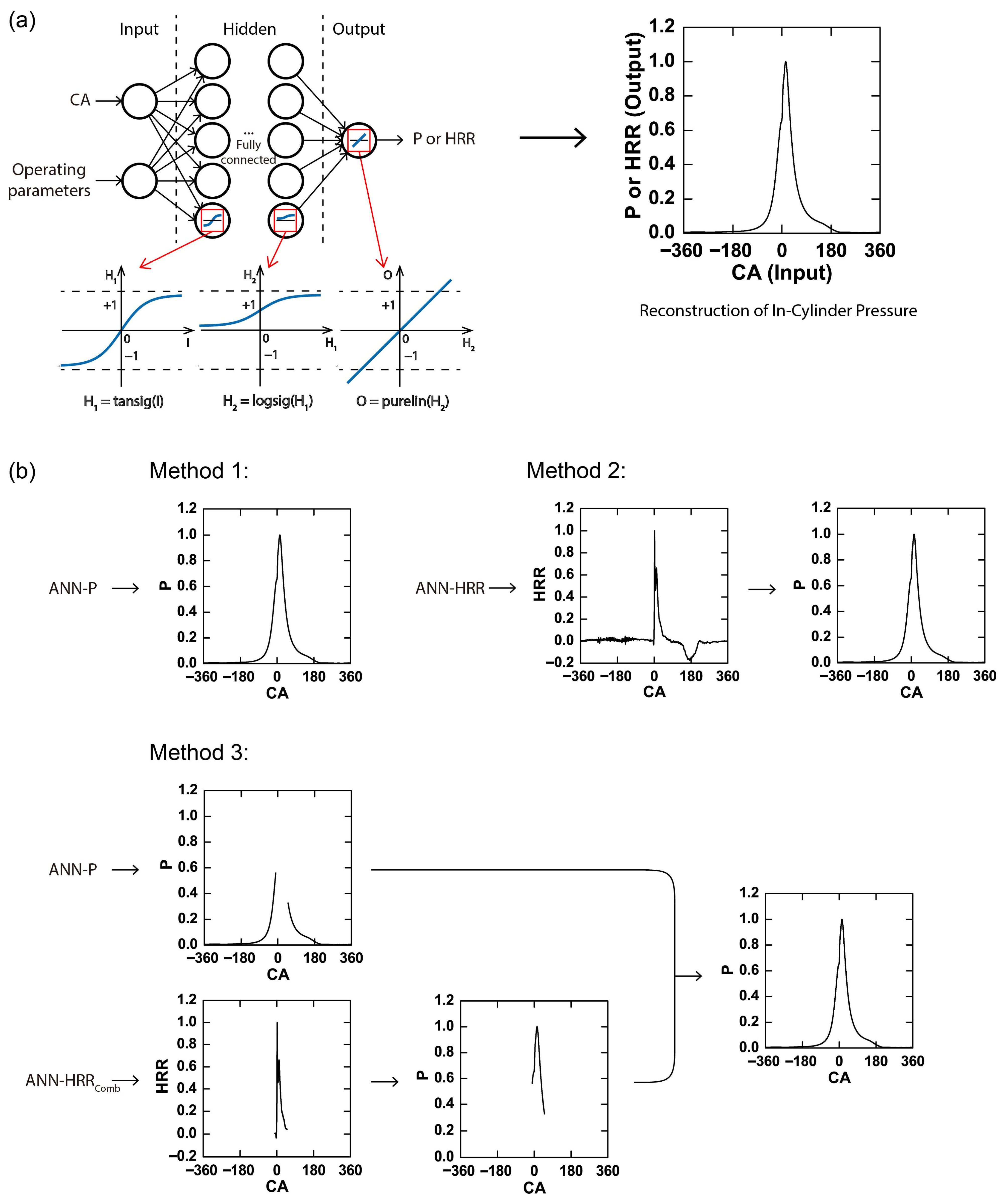 26]. Although restrictive, these assumptions establish a direct link between HRR and cylinder pressure, allowing pressure reconstruction from the energy release history. The distinction between Methods 2 and 3 lies in the HRR range considered. In Method 2, the neural network is trained to predict the full-cycle HRR, covering both combustion and non-combustion periods. With the initial pressure (defined by the intake pressure at a given altitude) as the starting condition, the entire cylinder pressure trace, comprising compression, combustion, expansion, and exhaust, can be reconstructed by integrating HRR over the full cycle. In contrast, Method 3 restricts the prediction to the combustion-phase HRR only, while HRR outside the combustion period is approximated as zero. Because this assumption provides insufficient information to recover pressure evolution during intake, compression, expansion, and exhaust, Method 3 necessarily combines two predictive models: (i) a pressure-prediction ANN to reconstruct cylinder pressure during non-combustion phases, and (ii) a combustion-HRR ANN to predict HRR during combustion and reconstruct pressure for that portion of the cycle. The final pressure trace is then obtained by splicing together the non-combustion pressure prediction with the combustion-phase HRR-based reconstruction.