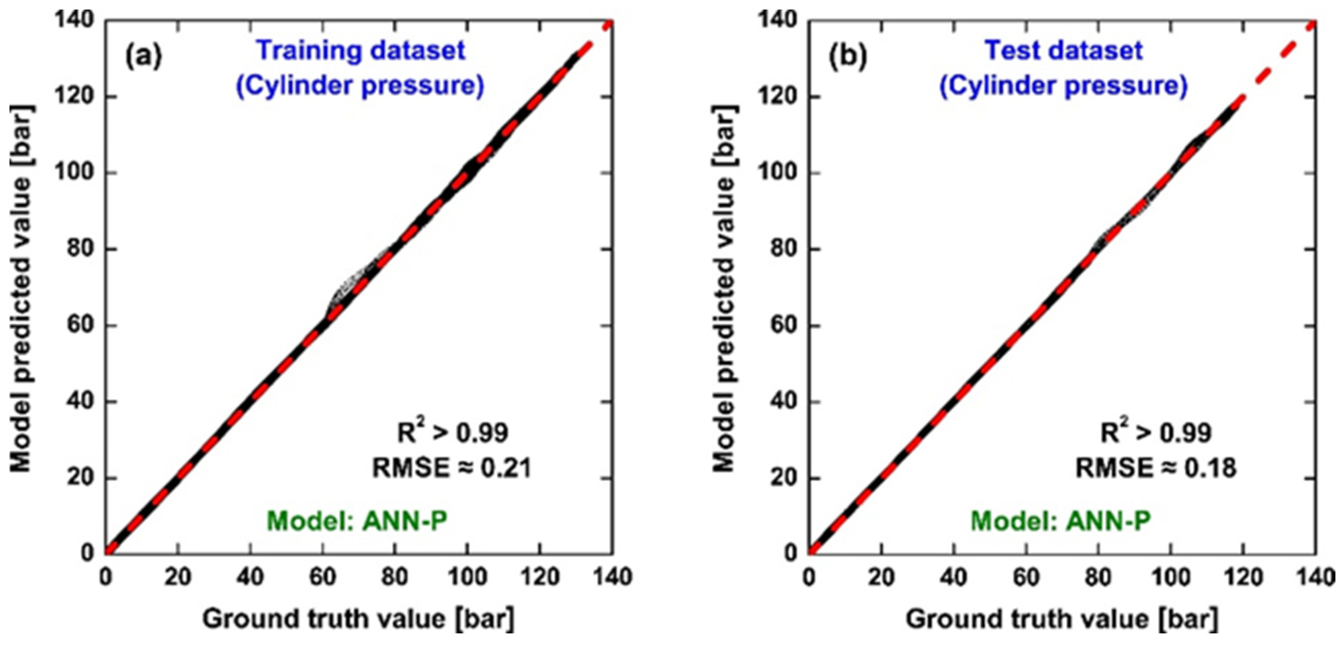 Figure 2 illustrates the performance of the ANN-P model in directly predicting in-cylinder pressure traces, with predicted values plotted against the corresponding experimental measurements. The 45° dashed line represents perfect agreement, and the close clustering of most data points along this line indicates excellent predictive accuracy. Both the training dataset (