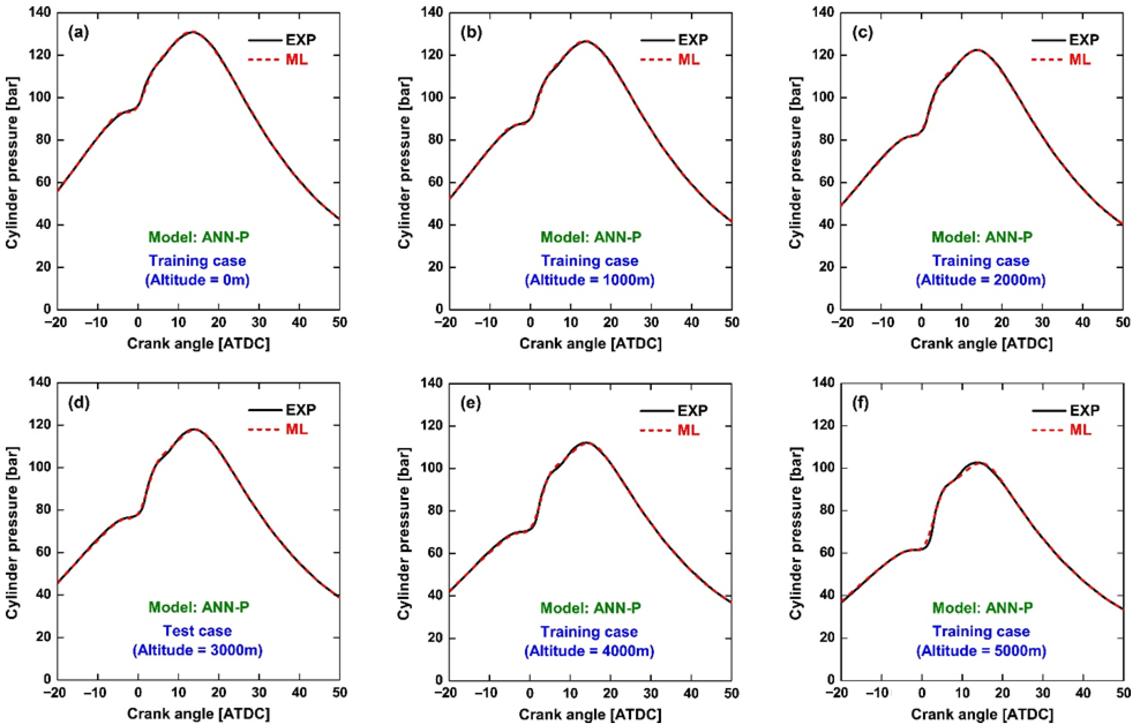 Figure 2 by directly comparing the predicted and experimental in-cylinder pressure traces across all operating points. The agreement between reconstructed and measured curves is nearly perfect for both the training altitudes (0–5000 m) and the unseen test altitude (3000 m), demonstrating that the network generalizes well to unmeasured conditions. The overall pressure evolution, including compression, the main combustion event, and the subsequent expansion, is accurately reproduced. Only minor discrepancies are observed during the rapid pressure rise following combustion, where the model slightly underpredicts or overpredicts the pressure slope. This deviation is consistent with the scatter observed in the 60–80 bar range in