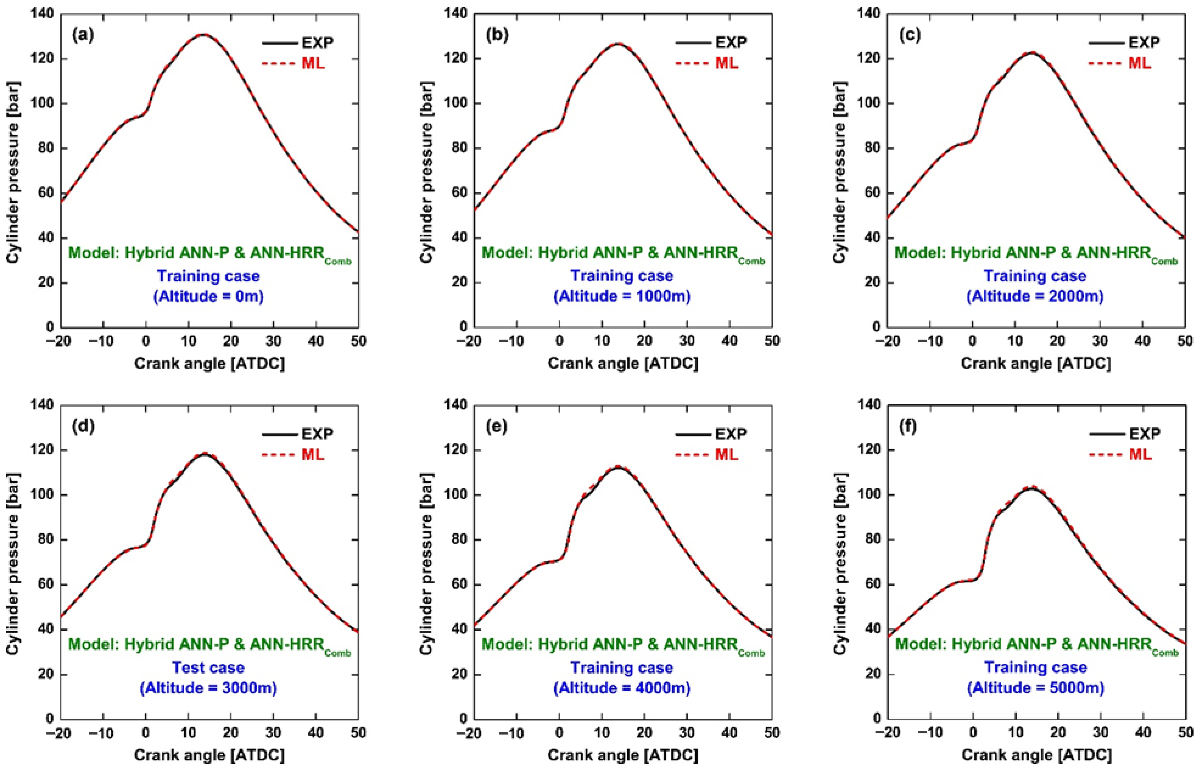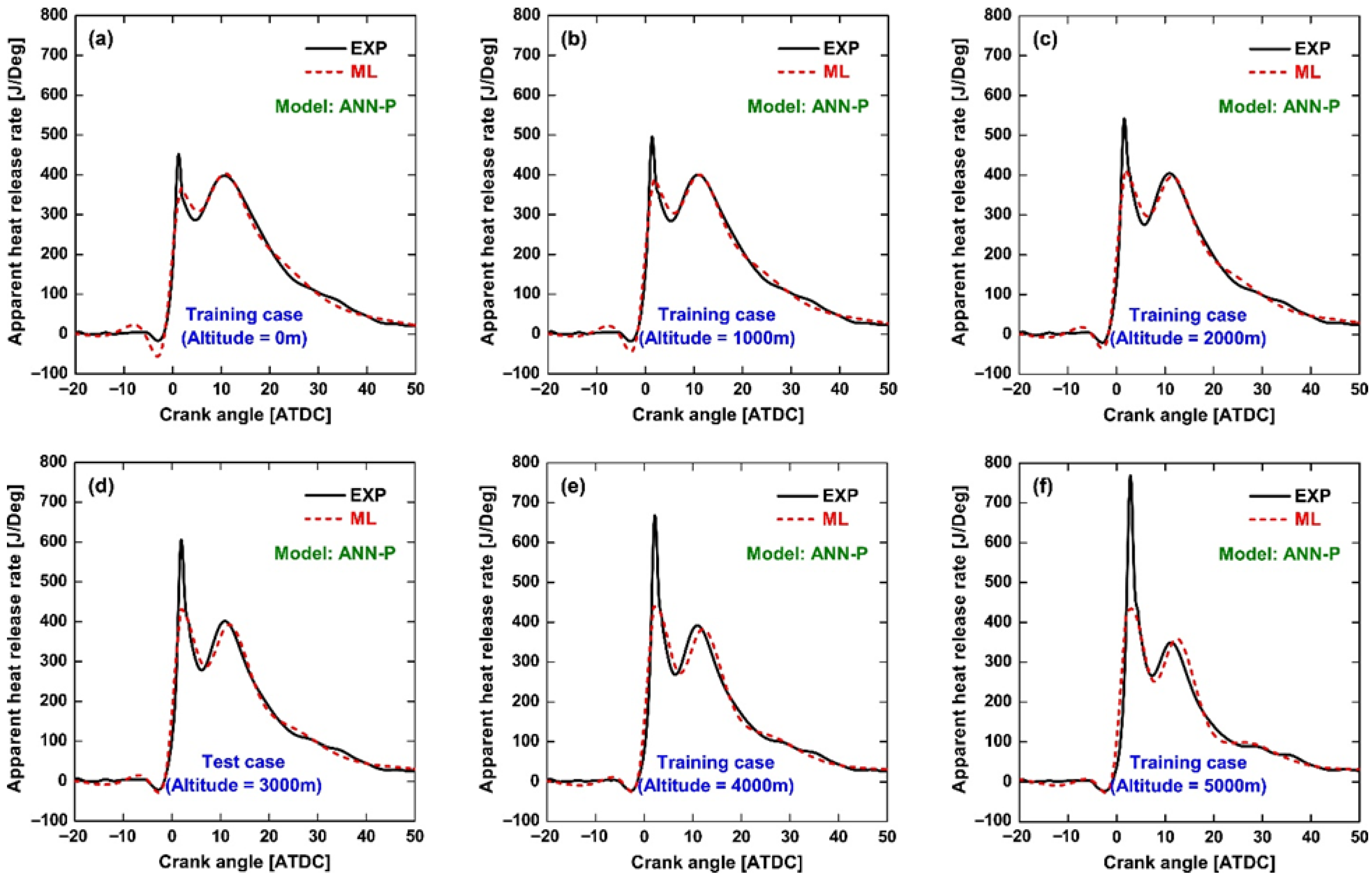 Figure 6 captured the premixed and diffusion combustion peaks with high fidelity, which dominate the rapid pressure rise after ignition. Nevertheless, systematic discrepancies emerge in the non-combustion regions, most notably during the intake and compression strokes where the true HRR approaches zero. In these intervals, the experimental HRR signal is inherently weak and often dominated by noise, leaving the network with limited physical information to learn from. As a result, the ANN predictions in these regions contain spurious fluctuations that, although small in magnitude, accumulate when integrated over crank angle. This accumulation manifests as baseline offsets in the reconstructed pressure prior to ignition. For example, at lower altitudes (0, 1000, and 2000 m), the predicted pressure at the onset of combustion is slightly lower than the measured values, whereas at 5000 m the opposite trend is observed, with the predicted pressure being slightly higher. By contrast, at intermediate altitudes such as 3000 and 4000 m, the predicted baseline aligns more closely with the experimental traces, leading to better overall agreement.