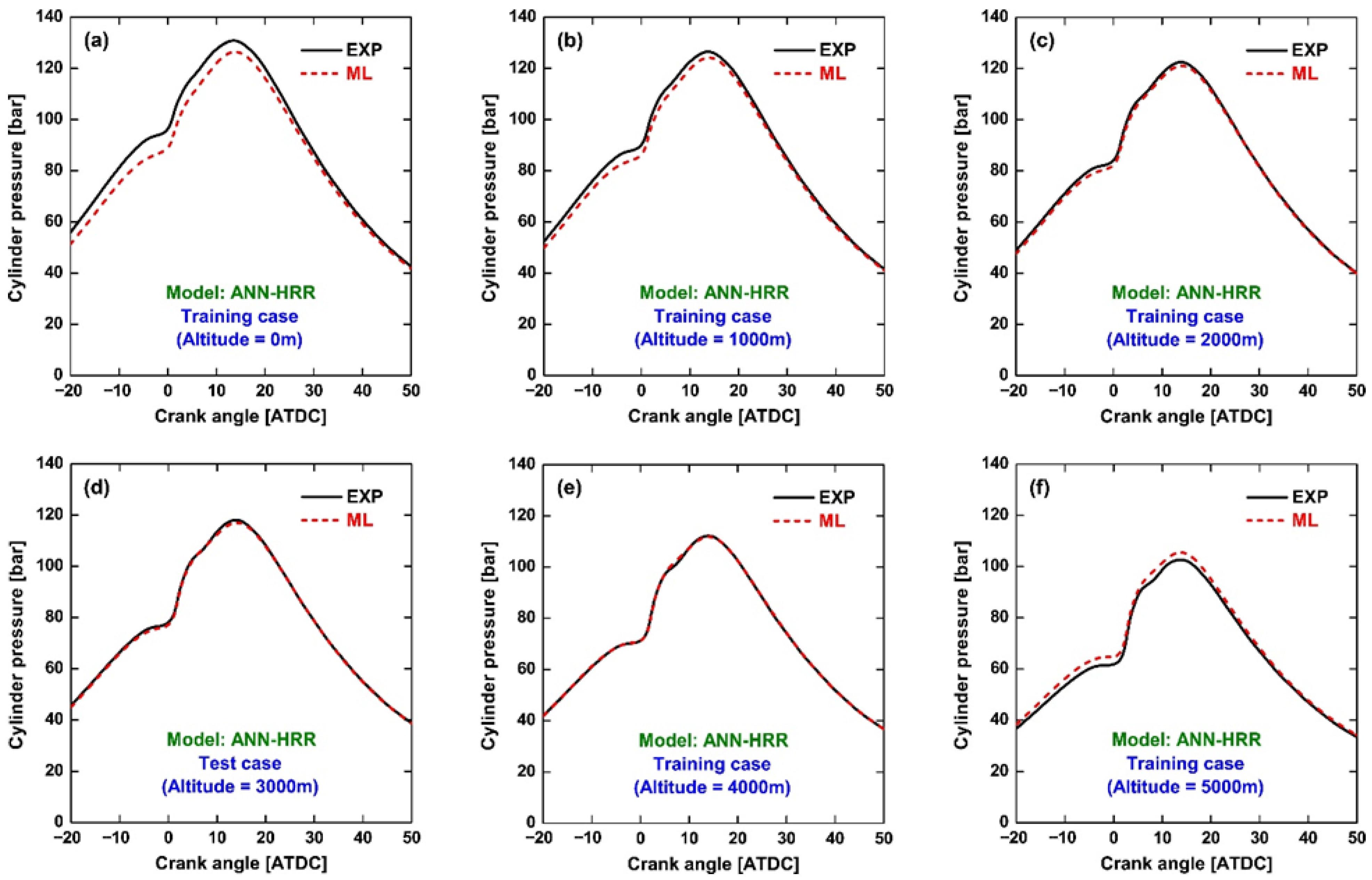 Figure 7 presents the reconstructed cylinder pressure traces obtained by integrating the ANN-HRR predictions. Overall, the model reproduces the pressure evolution across all altitudes with reasonable accuracy, particularly during the combustion phase where the predicted and experimental curves overlap closely. This consistency is expected, since the HRR predictions in