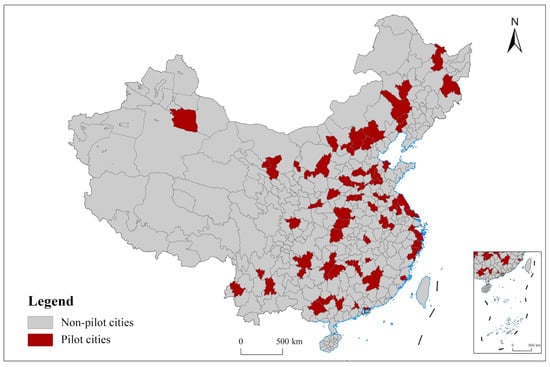 China’s renewable energy policy has evolved through a gradual process of legal institutionalization, policy experimentation, and strategic upgrading [21]. The Renewable Energy Law of 2006 laid the legal foundation, followed by the Medium- and Long-Term Renewable Energy Development Plan and successive Five-Year Plans, which elevated renewable energy to a national strategic priority. These top-level designs not only signaled the government’s long-term commitment but also created institutional space for pilot-based experimentation. Within this trajectory, the NEDC policy, launched in 2012 and implemented in 2014, marked a critical institutional innovation. The policy approved 81 cities and 8 industrial parks as the first batch of pilots, adopting a “pilot first, phased expansion” approach [22]. The distribution map of NEDC policy is shown in Figure 1. The spatial distribution of New Energy Demonstration Cities exhibits the characteristics of ‘coastal concentration, inland inclusion, and gradual progression,’ which not only highlights the leading role of the eastern region but also promotes green transition in central and western areas.