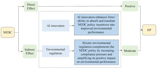 Drawing on firm- and city-level panel data from 2010 to 2022, this paper treats the NEDC policy as a quasi-natural experiment to assess its causal impact on EP. The results show that the policy significantly improves EP, and this finding remains robust across a wide range of tests, including parallel trend validation, placebo tests, PSM-DID, alternative outcome measures, and double machine learning estimations. Mechanism analysis reveals that firm-level AI innovation and environmental regulation amplify the policy effect: AI innovation enhances firms’ ability to absorb and translate policy incentives into green practices, while stricter regulation increases compliance costs and reinforces the policy’s incentive effect through institutional complementarity. Heterogeneity analysis indicates that the policy effect is stronger in state-owned enterprises, large firms, and regulated industries, but weaker among non-state-owned firms, small firms, and unregulated industries. Overall, the results demonstrate that the NEDC policy strengthens corporate EP through both internal capability and external constraints, providing new empirical evidence on the institutional boundaries of green policy effectiveness in the context of China’s dual carbon strategy. It also provides reference experience for the green transformation of developing countries.
