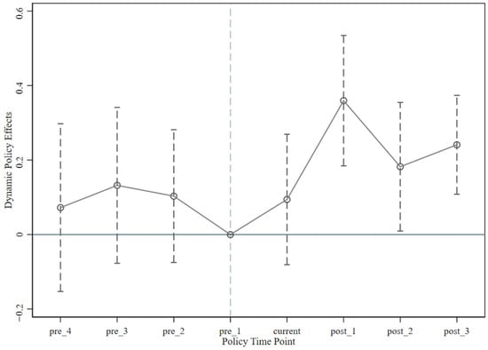 Table 3 reports the DID estimates of the NEDC policy on EP. Across all model specifications, the NEDC coefficient remains positive and significant. After controlling for firm, industry, and year fixed effects, the estimated effect stabilizes at around 0.159–0.167. This magnitude is economically meaningful. Considering that the mean EP score in our sample is 1.807, the policy effect corresponds to an improvement of nearly 9% relative to the baseline level. In other words, locating in an NEDC after policy implementation raises a firm’s probability of establishing environmental management systems, ISO certification, or green disclosure practices by a considerable margin. Such improvements reflect not only compliance adjustments but also strategic integration of environmental governance into corporate decision-making.