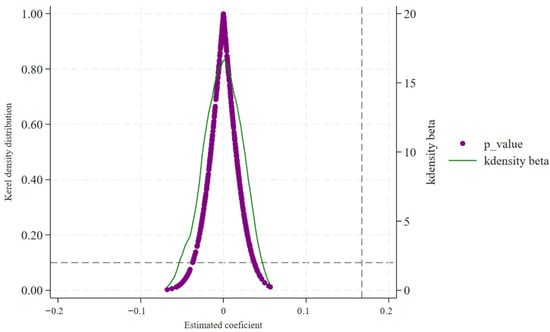 To confirm that the baseline regression results are not driven by model specification or sample structure but are attributable to the NEDC policy, we conduct a placebo test. Specifically, we randomly reassign the treatment group and policy timing 500 times, re-estimate the policy effect, and plot the kernel density distribution of the simulated coefficients (see Figure 4). The results show that most randomized coefficients cluster symmetrically around zero, with a mean close to zero, suggesting that without actual policy intervention, no systematic or significant effect emerges. On the contrary, the true DID coefficient from the baseline regression lies far to the right of the simulated distribution, clearly separated from zero and located in the tail region. This divergence suggests that the positive association between the NEDC policy and EP is not randomly driven but reflects a genuine causal impact of the policy. Overall, the placebo test reinforces the robustness of the baseline findings, indicating that the NEDC policy has significantly improved firms’ EP through institutional incentives and the optimization of resource allocation.
