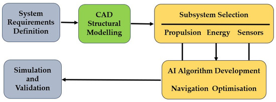 Workflow of the proposed methodology, integrating UAV design, energy modelling, and AI-based navigation.