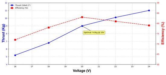 Figure 3 shows the thrust and efficiency curves, determined by the manufacturer’s certificates and obtained in the anemometric chamber according to the ISO 12345:2022 protocol [58]. The left Y-axis represents thrust (kg) generated by the 18 × 6.1 carbon fibre propellers, while the right Y-axis indicates motor efficiency (%). The X-axis shows the operating voltage range (16–24 V). The thrust increases linearly with voltage, reaching a peak of 9.0 kg at 20 V, while efficiency remains above 80% throughout the operating range.