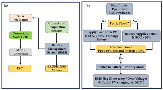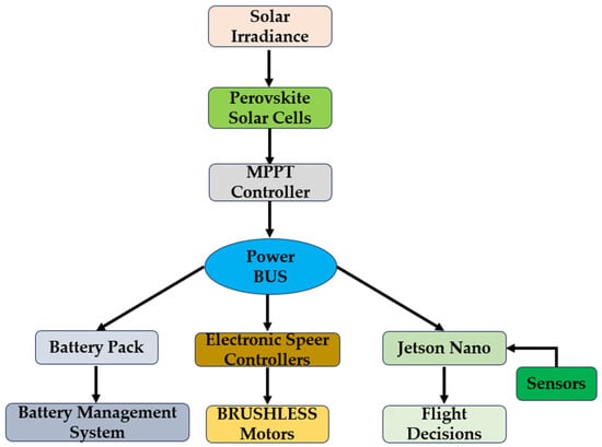 where Pch is charging power from PV/MPPT (W) and Pdis is discharge power delivered to the load (W). In our EMS the charge request is issued only if SOC < SOCcharge_cutoff and PPV > 0; similarly, discharge is prevented when SOC ≤ SOCdischarge_limit. All variables are clipped to maintain SOC ∈ [0, 1]. The electrical architecture includes current and temperature sensors that send data to the BMS. The BMS’s function is to supervise charge distribution, thermal protection, and fault detection. Performance data, obtained from MATLAB/Simulink, is validated by manufacturers’ data sheets and modelling methods. This approach ensures the reliability of the energy system and control algorithms prior to field implementation. To improve the clarity of the system architecture and aid in reproducing the proposed UAV design, a flowchart (Figure 5) has been added to visually illustrate the electrical interaction between the photovoltaic modules and the onboard power supply system. The electric architecture consists of current and temperature sensors, which feed data to the BMS. The BMS is tasked with charge distribution management, thermal protection, and fault detection. The performance results from MATLAB/Simulink are validated against manufacturers’ datasheets and modelling strategies. This step ensures the integrity of the energy system and control algorithms before field implementation. To improve the system architecture transparency and reproducibility of the proposed UAV design, a flowchart (Figure 5) has been added to give a graphical illustration of the electrical interface between the photovoltaic modules and onboard power system. The EMS here is based on a hierarchical control strategy that prioritises the use of photovoltaic power to attain maximum exploitation of the renewable energy source, followed by charge and discharge cycle regulation of the battery for optimisation of its life and operation safety. The dynamic response to environmental variations is provided through real-time monitoring by onboard sensors for maintaining system stability with fluctuating loads and irradiance levels. In addition, fault tolerance measures within the BMS protect against overcurrents, overheating, and voltage irregularities, thus enhancing system robustness. The use of validated simulation tools and empirical manufacturer data provides a comprehensive verification of system performance across different mission profiles, entrenching confidence in the operational feasibility of the drone. This integrated design approach underscores the importance of energy-efficient management systems in extending mission autonomy and facilitating sustainable drone operations.