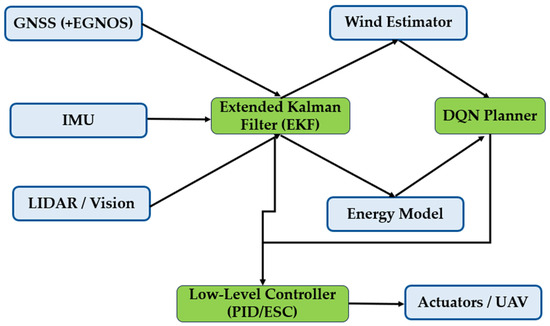 Sensor fusion and data-flow pipeline integrating GNSS, IMU, and LiDAR inputs with EKF, wind and energy models, the DQN planner, and low-level control for UAV actuation.