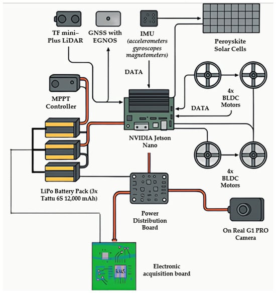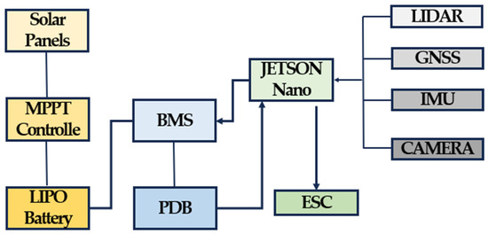 Figure 8 describes the functional connections between Jetson Nano and the onboard subsystems. Specifically, it shows the connections between the LiDAR, GNSS, and IMU sensors, the power management components, and the propulsion control units (ESCs). The diagram reflects the actual configuration adopted in the system, clarifying the operational structure.