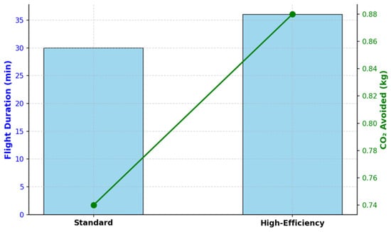 Although the analysis is not based on physical prototyping, it integrates the manufacturers’ data sheets and discharge curves. Numerical simulations conducted in MATLAB/Simulink show realistic mission profiles (take-off, cruise, manoeuvre, and landing). Data sources ensure the robustness and reproducibility of the energy assessment while maintaining a strong connection to empirical evidence. The architecture incorporates a battery management system (BMS) compliant with IEC 62133 standards. Safety is ensured by integrated current and temperature sensors and a passive cooling system that utilises heat sinks and guided airflow. These features extend battery life, reducing the risk of thermal runaway and supporting the integration of renewable energy components within the system. The search for reliable power sources for drones is increasingly intersecting with research into renewable energy. The perovskite photovoltaic modules mounted on both the drone’s arms and fuselage reflect the studies [60,61]. The modules are interfaced via an MPPT controller, ensuring optimal energy harvesting under varying irradiance conditions. The simulation results under standard AM1.5 conditions indicate that the photovoltaic contribution can offset up to 15–20% of the energy demand during the cruise phase. This hybrid approach mitigates the depth of discharge cycles, extending the effective lifespan of LiPo batteries; reduces dependence on ground charging infrastructure, thereby increasing the operational flexibility of drones in decentralised and densely populated urban environments; and contributes to measurable environmental benefits, with estimated annual CO2 emissions reduced to 82.9 kg compared to the nearly 1000 kg produced by an equivalent diesel-powered delivery vehicle. A schematic representation of the hybrid energy management strategy is shown in Figure 4.