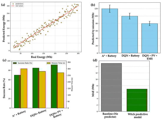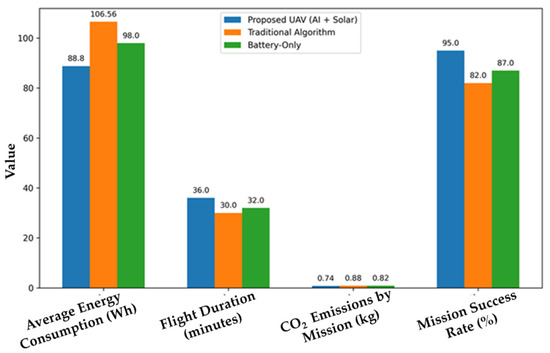 The present work reports simulation-based feasibility and a staged validation plan (Section 3.10). Any commercialisation statements are therefore exploratory and dependent on (i) successful HIL and laboratory validation of MPPT/BMS and PV yield under flight conditions, (ii) certified outdoor trials under regulated conditions, and (iii) regulatory and safety compliance. Recent advances in UAV navigation have explored a wide range of techniques, from traditional algorithms such as A* and Rapidly Exploring Random Trees (RRT) to deep reinforcement learning (DRL) methods like Deep Deterministic Policy Gradient (DDPG) and Twin Delayed DDPG (TD3). While traditional methods offer deterministic path planning, they often lack adaptability in dynamic environments and do not optimise for energy or environmental constraints. DRL variants such as DDPG and TD3 provide continuous control and high precision but require significant computational resources, making them less suitable for real-time inference on embedded platforms. In contrast, our proposed DQN-based approach offers a practical balance between performance and computational efficiency. It supports multi-objective optimisation (energy, risk, wind), operates efficiently on edge hardware (Jetson Nano), and integrates seamlessly with renewable energy constraints. The proposed system offers a new direction for urban resilience [23]. To contextualise the performance of the proposed UAV with respect to the state of the art, a comparative analysis was carried out that included four well-known drones for logistical, environmental or experimental use: DJI Matrice 300 RTK, Wingcopter 198, Solar Impulse UAV and Black Eagle 50.