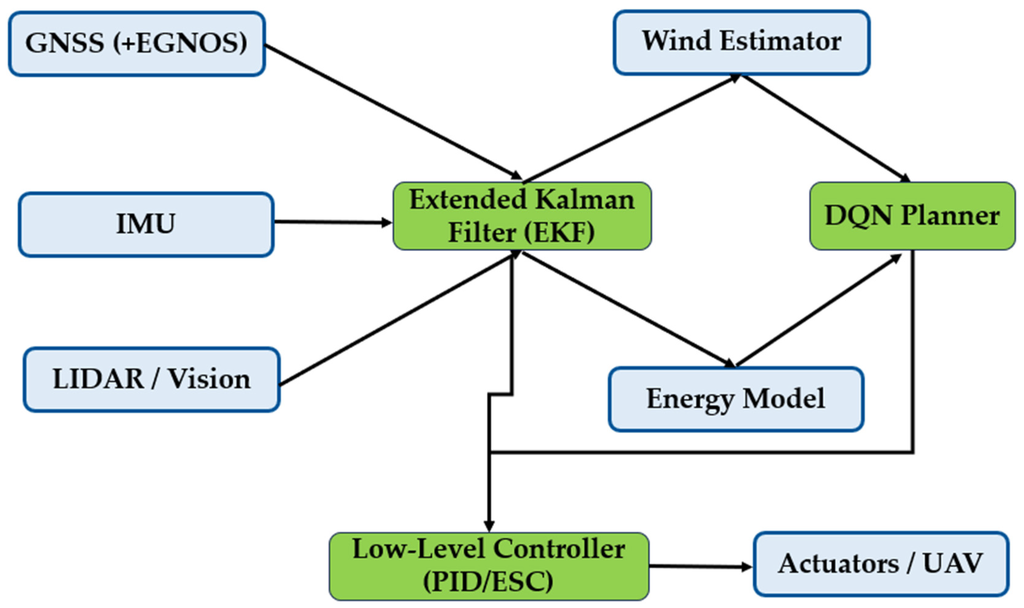 The prototype sensor suite includes a LiDAR TFmini Plus for short-range obstacle detection, a u-blox NEO-M8N GNSS receiver (EGNOS-compatible) for positioning, an ICM-20948 IMU providing triaxial accelerometer/gyroscope/magnetometer data, and an MS5611 barometric altimeter for altitude refinement. Figure 6 clarifies the full data fusion pipeline: sensor raw data are processed by the EKF to estimate position and velocity; the wind estimator combines GNSS and IMU inconsistencies with energy model deviations to approximate turbulence intensity; the DQN planner consumes this enriched state to optimise trajectories in real time. This explicit flow addresses reproducibility by showing the relation between input signals, fusion logic, and final control outputs.