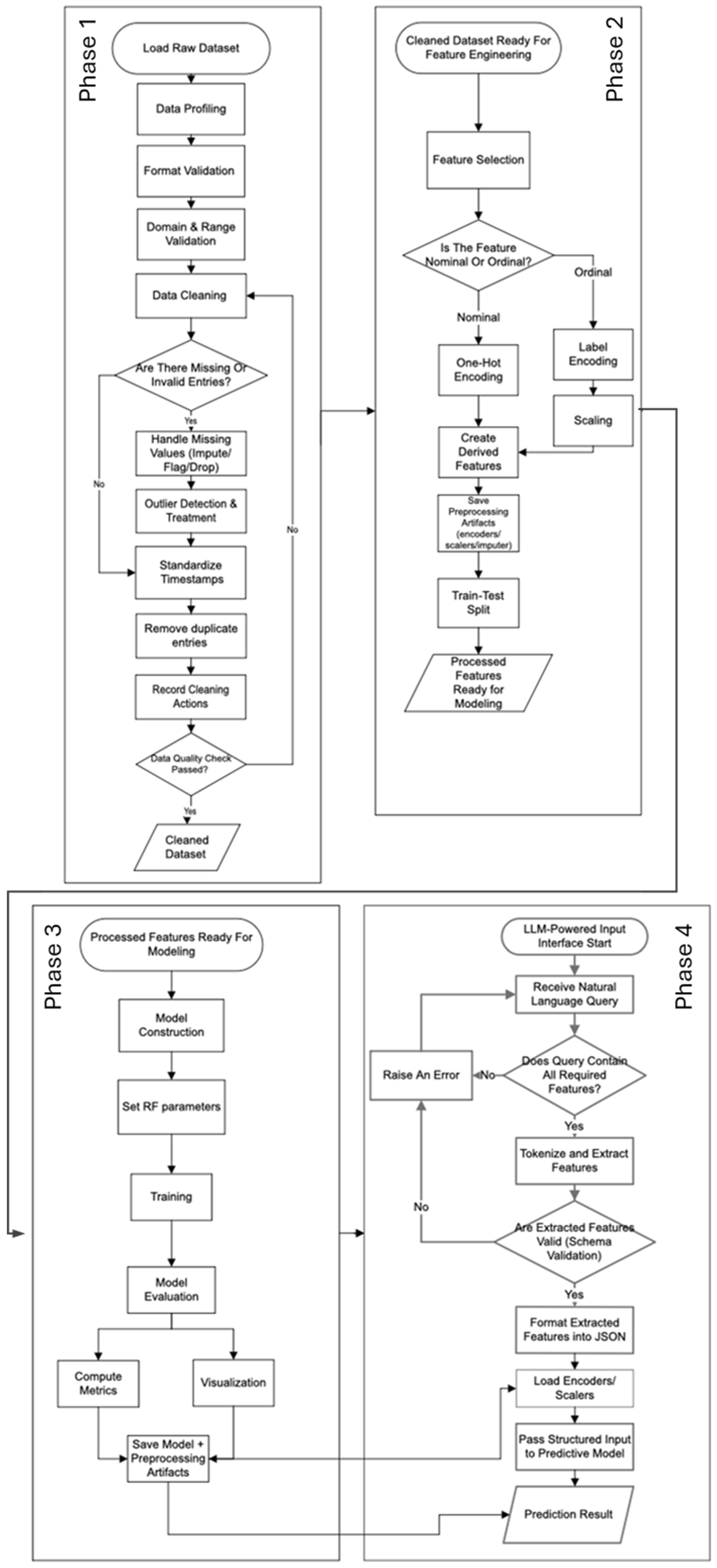 The proposed methodology follows a structured, multi-phase approach to ensure a robust and effective analytical framework. It is divided into four distinct phases, each playing a critical role in the overall workflow: data cleaning, feature engineering and encoding, model development, and LMM-powered interface integration. Each of these phases is illustrated in