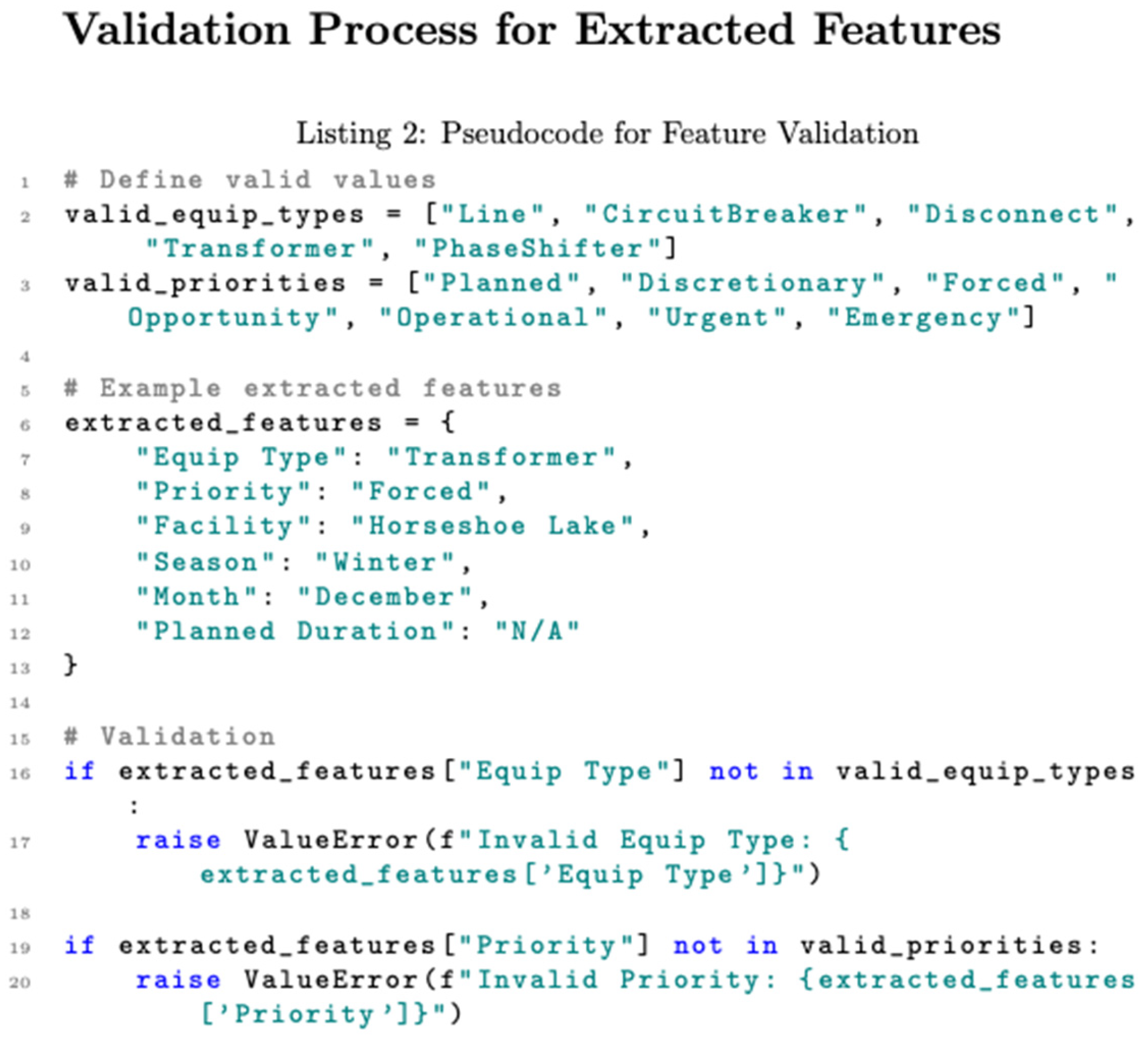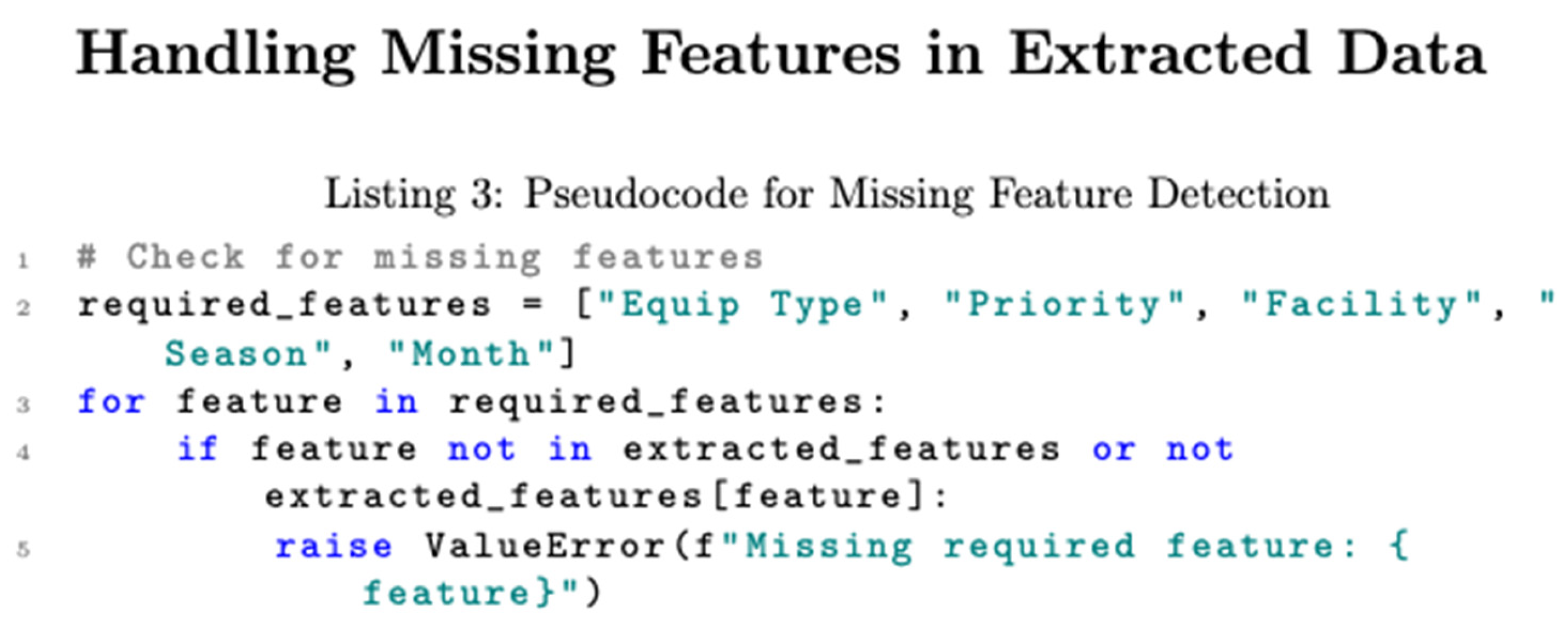 On ambiguous or incomplete inputs, the LLM is configured to detect missing features and handle them appropriately to maintain data accuracy and integrity. If a required feature is missing, the system raises an error and rejects the input to prevent incomplete or misleading outputs. For example, if the required features are EquipType, Priority, Facility, Season, and Month, and the query omits Priority, the system halts execution and raises an exception. The following pseudocode in
