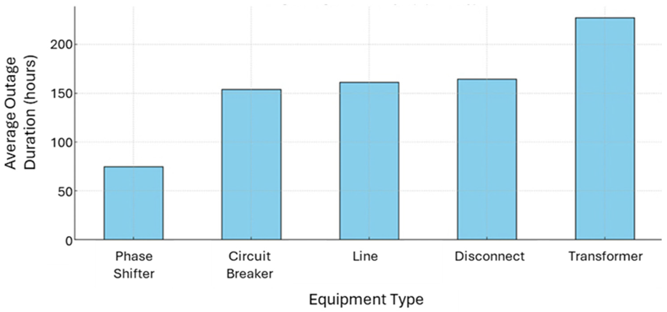 Figure 6, transformers and disconnects experience the longest average outage durations, exceeding 200 h. The prolonged duration associated with transformer repairs highlights the complexity of their maintenance, which often requires significant resources and time. Transmission lines also exhibit high average durations, reflecting the logistical difficulties of repairing extensive outdoor infrastructure. Conversely, phase shifters exhibit the shortest average outage durations, suggesting efficient repair and robust design. However, given their critical function, even brief outages can have severe repercussions. Addressing these issues through targeted investments in repair efficiency and maintenance schedules can significantly improve overall grid resilience.